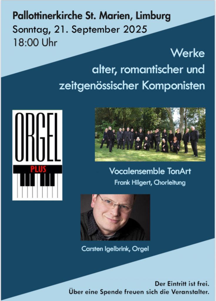 Auf ein besonderes Konzert, bei dem sowohl Chor- als auch Orgelmusikfreunde auf ihre Kosten kommen, freuen wir uns schon sehr! Am 21. September um 18:00 Uhr dürfen wir zusammen mit dem wunderbaren Domorganisten Carsten Igelbrink ein Konzert in der Reihe “Orgel plus” in der Limburger Pallottinerkirche St. Marien mitgestalten. Unser Chorleiter Frank Hilgert hat ein vielseitiges Programm mit klangvoller Vokalmusik und spannenden Werken für Orgel und Chor zusammengestellt. Dabei bewegen wir uns vom Frühbarock bis in unsere Zeit. Von Carsten Igelbrink dürfen wir und unser Publikum die Nr. 5 aus den „6 Studien für den Pedalflügel“ Opus 56 von Robert Schumann und eine Improvisation an der dreimanualigen Orgel in der Klosterkirche genießen.